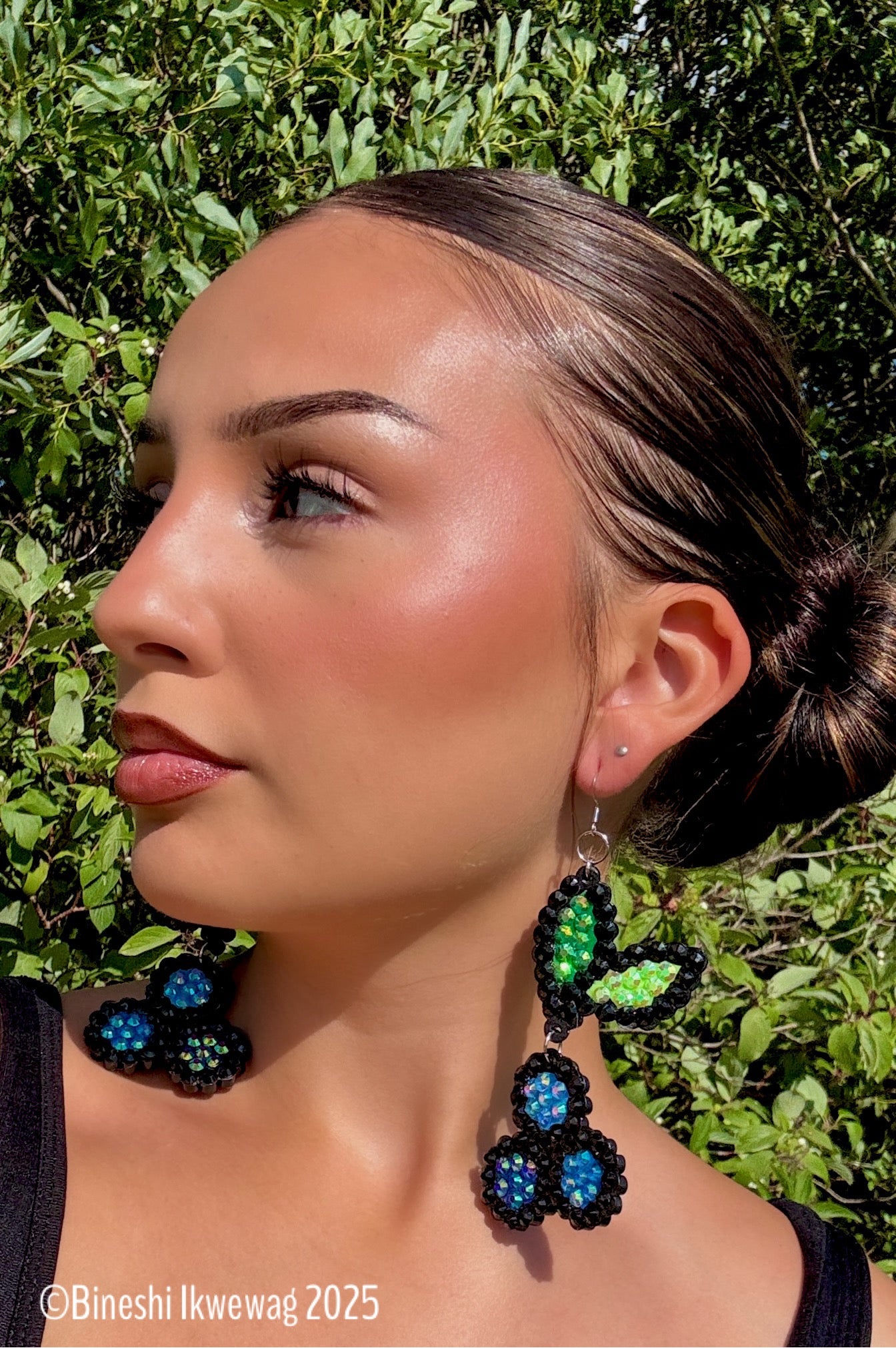 Inspired by wild blueberries, these berry cluster earrings measure 4 inches long. One of a kind. Made by Angela LaRocque.