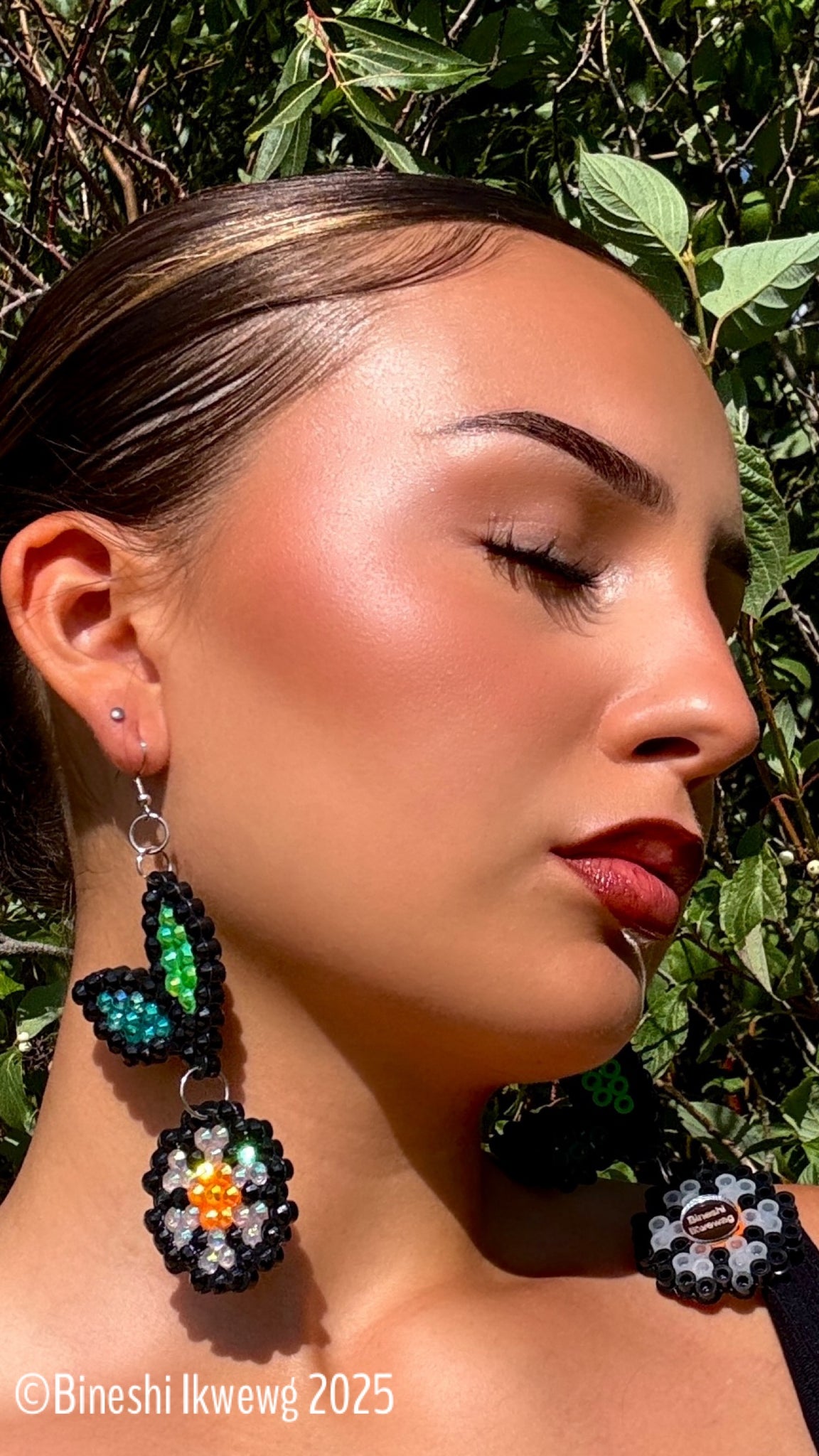 These clear/black floral and green leaf earrings measure 4 inches long by 1.75 inches wide. Super light earrings! Jewels on one side. Made by Angela LaRocque.