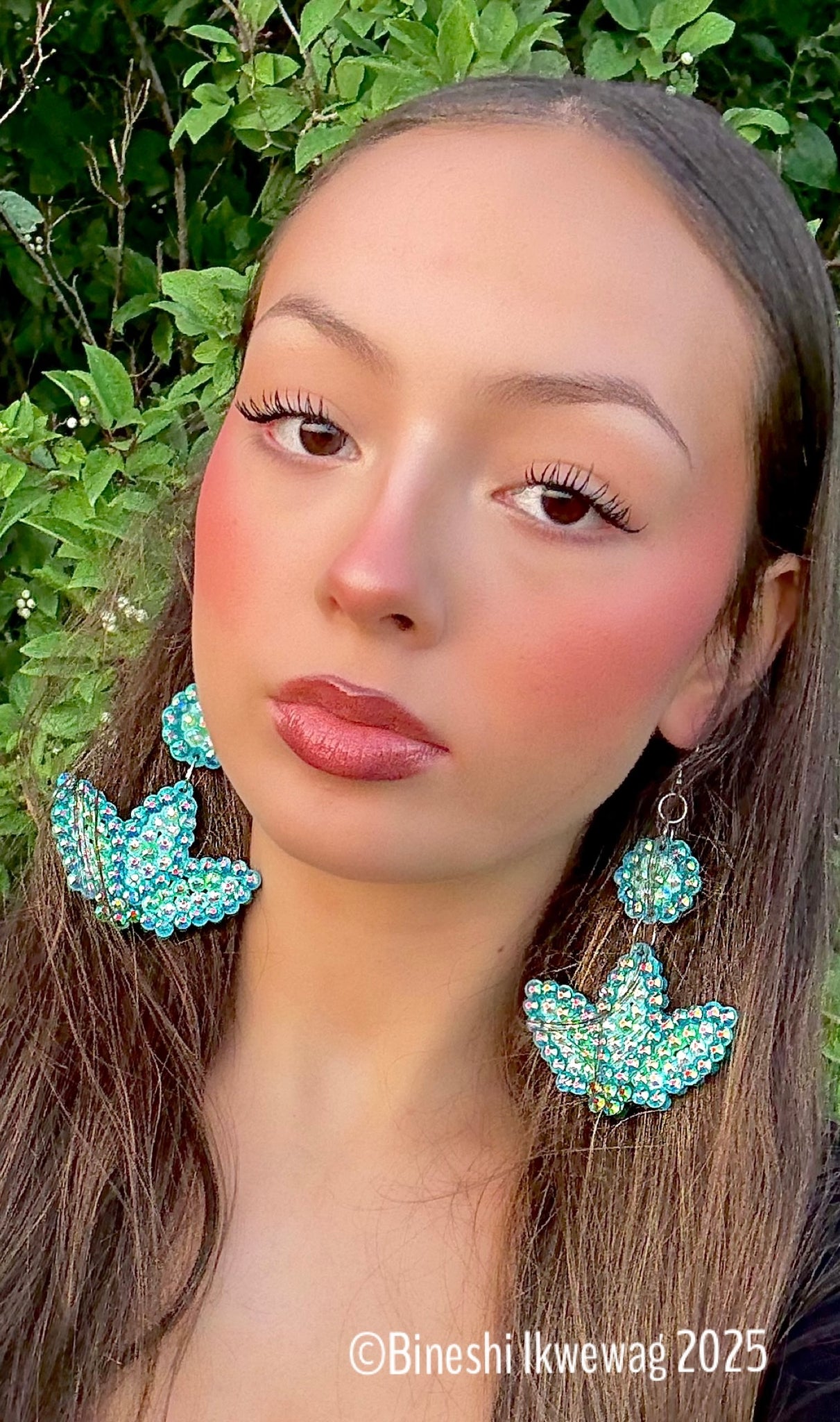 These bright aqua floral earrings are sure to get noticed. They are one of a kind earrings measuring 3.5 inches by 2.75 inches at widest. Jewels on one side. Made by Angela LaRocque